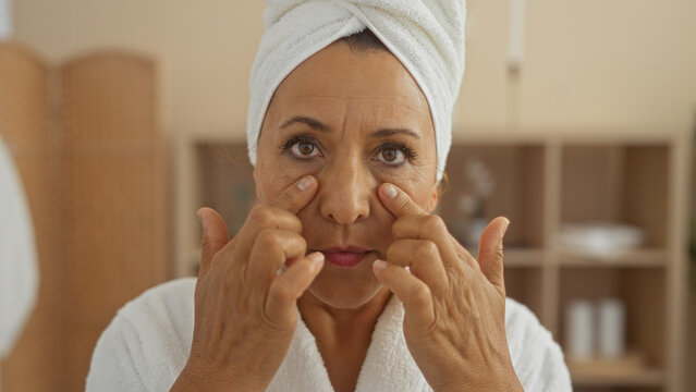 An elderly hispanic woman with a towel on her head applies skincare in a serene spa setting, emphasizing mature beauty care routine indoors.