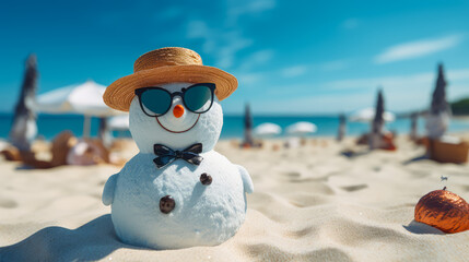 Funny snowman in hat and sunglasses on sandy beach. Christmas vacation concept to warm countries.