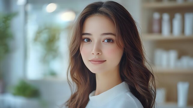 Young Asian woman with long wavy brown hair and natural makeup smiling softly in spa or salon setting with blurred shelves of products in background.