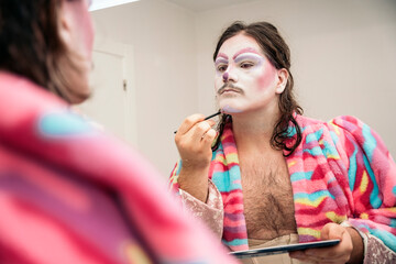Clown putting on makeup in the mirror getting ready for show