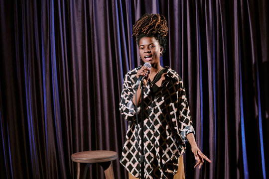 Female comedian performing stand-up comedy on stage holding microphone with stool in background. Entertaining audience with her humor and expressive gestures