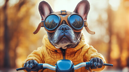 A cute French Bulldog riding an electric scooter with aviator goggles in a nature park. Creative digital illustration of a funny pet, ideal for festive season greeting cards and humorous wallpaper