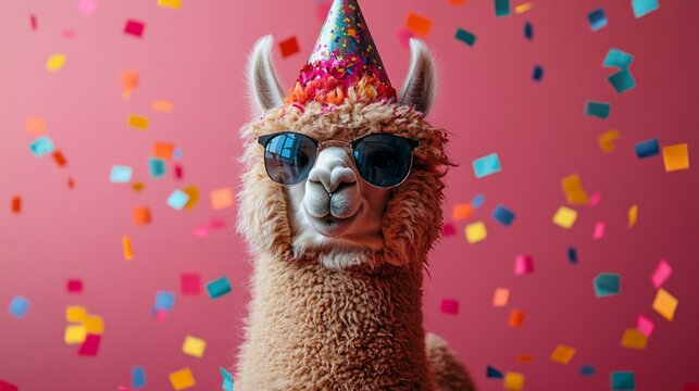 alpaca wearing colorful party hat and funky sunglasses, surrounded by confetti on bright pink background