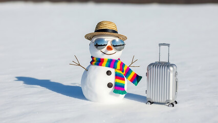 Snowman with Suitcase Winter Vacation Travel Concept