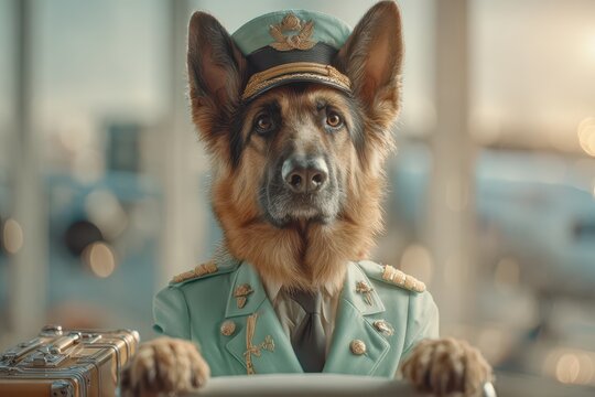 Anthropomorphic German Shepherd dog dressed as an airport officer stands proudly with a suitcase near the airport windows, looking forward to the next mission.