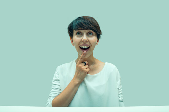 cunning fat cruel man going to do criminal illegal act, isolated blue background. studio shot.
