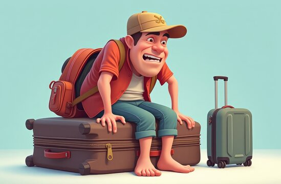 tired illustrated male traveler sitting on luggage in huge suitcase. vacation adventures with humor. travel challenges, journey preparations, tourism.