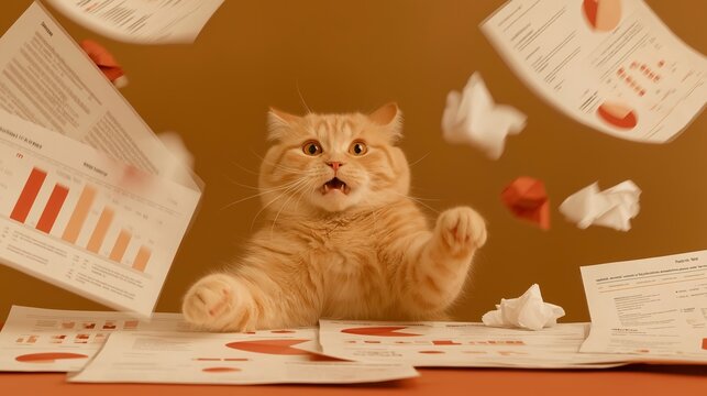 A fluffy ginger cat looks overwhelmed as papers fly around, symbolizing stress and chaos. The humorous office concept captures frustration, burnout and comical expression