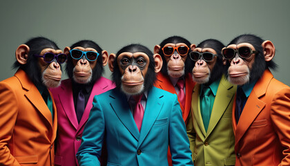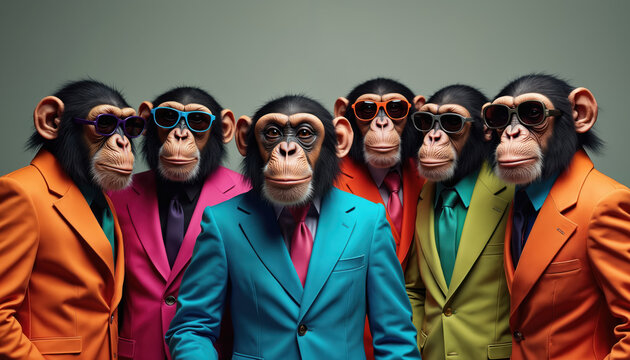Six chimpanzees dressed in colorful suits, sunglasses pose together for stylish group portrait. Playful illustration captures trendy, fun, sophisticated animal fashion theme. Ideal for humorous