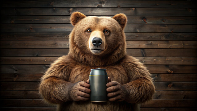 A realistic brown bear holds a beer can against a rustic wooden background. This humorous and surreal illustration combines wildlife with anthropomorphic charm, creating a cozy, inviting scene