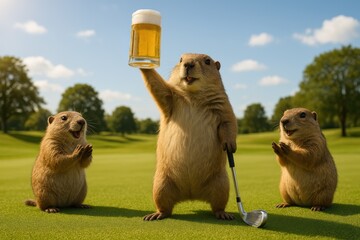 Joyful gopher toasting beer on golf course. Use for party invites, bar advertising, sports promotions, and humorous lifestyle branding.
