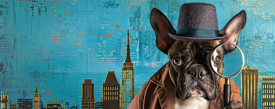 Detective dog with a magnifying glass, vintage city backdrop for mystery-themed invites