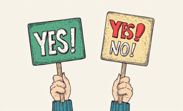 Cartoon illustration of two hands holding signs with 'YES!' and 'YES! NO!'.