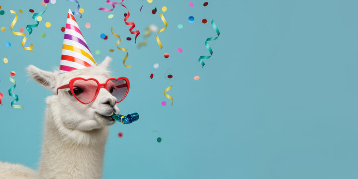 Funny white llama alpaca blowing party horn in party hat and red heart-shaped sunglasses, amid confetti, blue background, playful humorous celebration concept, birthday design. Copy space