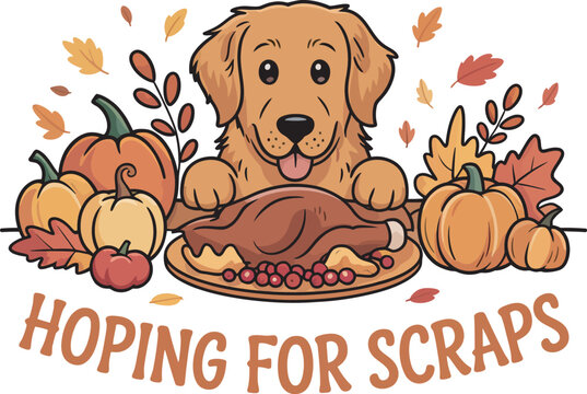 Humorous Canine Illustration with Autumnal Elements and a Plea for Table Scraps