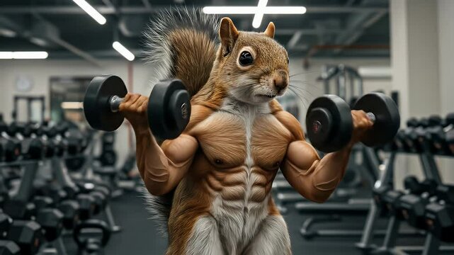 Muscular hamster lifting dumbbells gym defocused showing biceps, faceless strength training, fitness visualization detail, blurred humorous background, workout concept, creative in