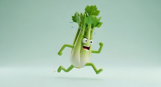 Funny 3D Cartoon Celery Character Running Fast on a Light Green Background