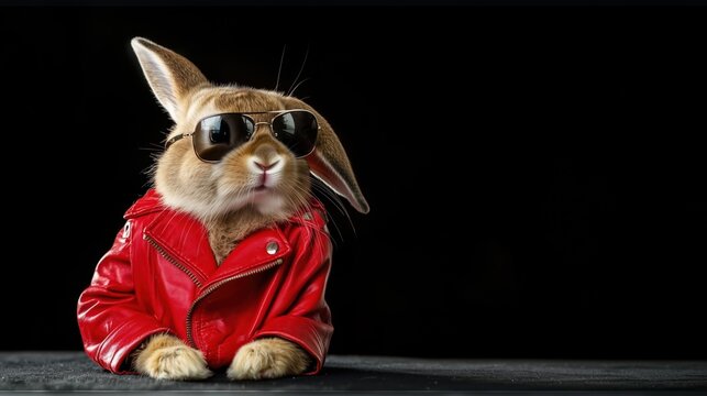 A confident rabbit wearing a red leather jacket and sunglasses poses against a dark background. The stylish and humorous concept blends fashion and animal portraiture, creating a unique and eye-catchi