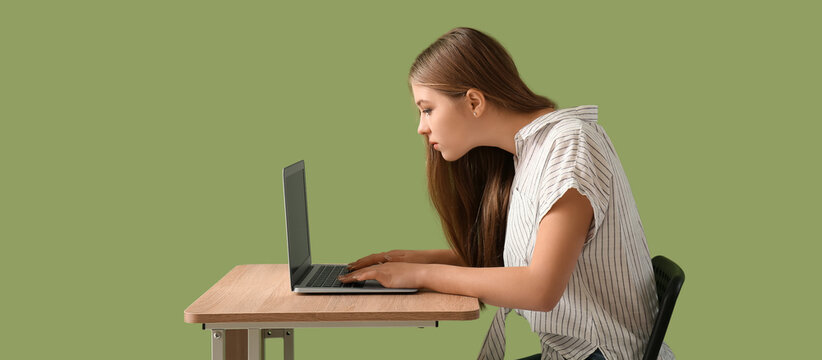 Teenage girl with bad posture using laptop while sitting at table against green background
