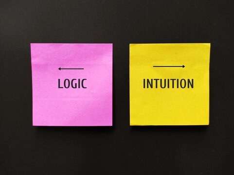 Pink and yellow note with text LOGIC and INTUITION point to different direction,  concept of choosing logic to make decision or follow instinct trusting intuition which valuable in some circumstance