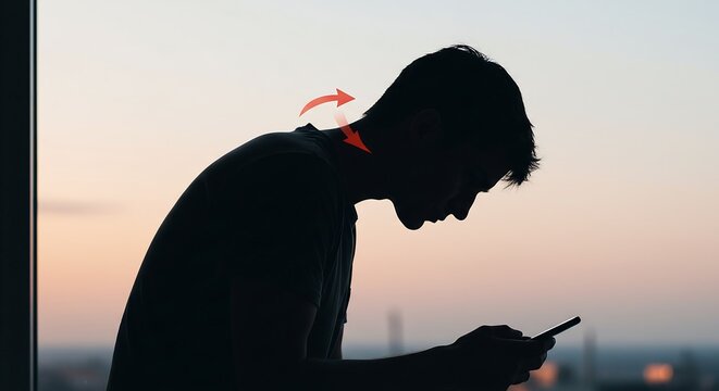 man using phone with forward head posture text neck hunching over device against sunset illustrating health concern and poor posture