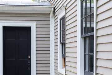 Two vintage double hung windows with a black door on a beige color exterior wooden wall of a house. The windows are dark green with white trim. There's snow on the ground and steps of the entrance.