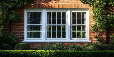 Exterior view of double hung sash windows classic white wooden frames with vertical divisions set in a red brick facade of a traditional British home natural daylight