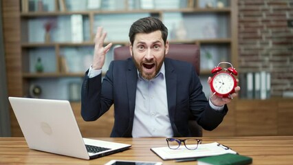 Nervous displeased bearded mature business man looking at camera holding in hands and pointing at clock asking to hurry up and warning about deadline sitting next to laptop computer at modern office