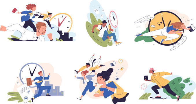 Hectic pace of life. Hurried people chase to clock, pressured time person busy managers rush run or late in office hurry work marathon