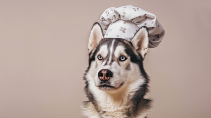 playful siberian husky in chef's hat with  prints, adorable cooking theme