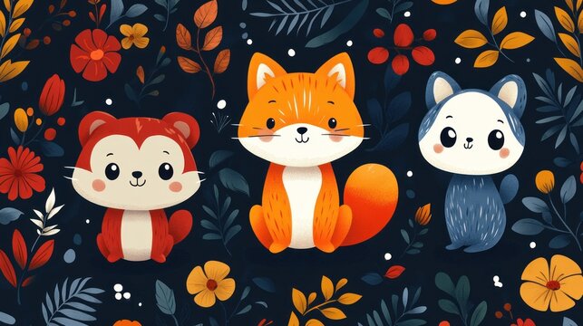 A cute fox, squirrel, and husky sitting in a floral pattern.