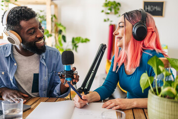 Happy influencers recording podcast together at home