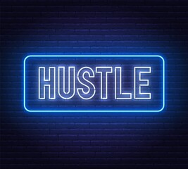 Hustle neon text on brick wall background. Inspirational motivating glowing lettering.