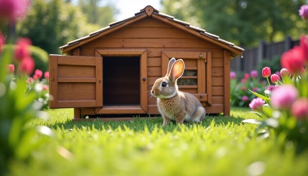 A brown rabbit peeking out from a large wooden hutch in a blooming garden under bright sunlight