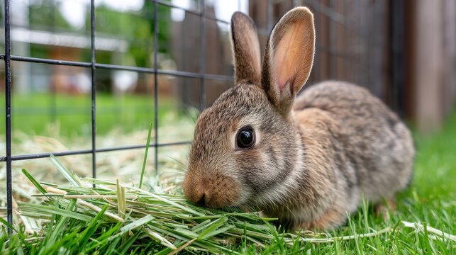 A brown and gray rabbit eats grass near a wire fence, enjoying a meal in an outdoor enclosure.