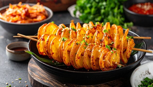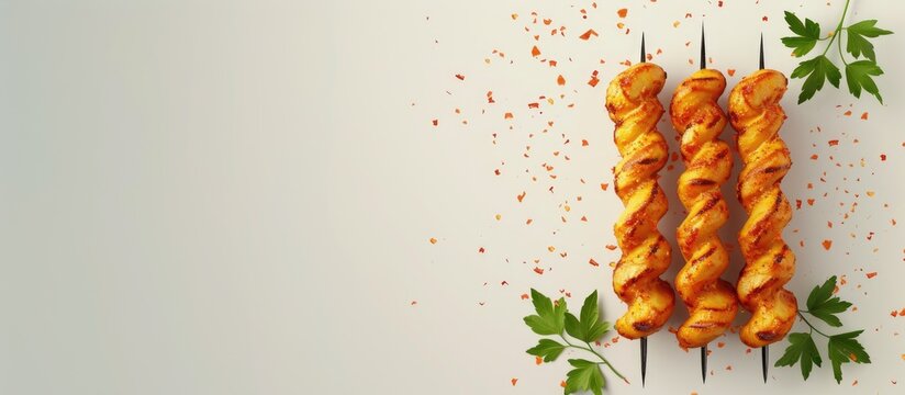 Group of Hweori Gamja Tornado Potato Spiral Potato Skewers Helical Shape. with copy space image. Place for adding text or design