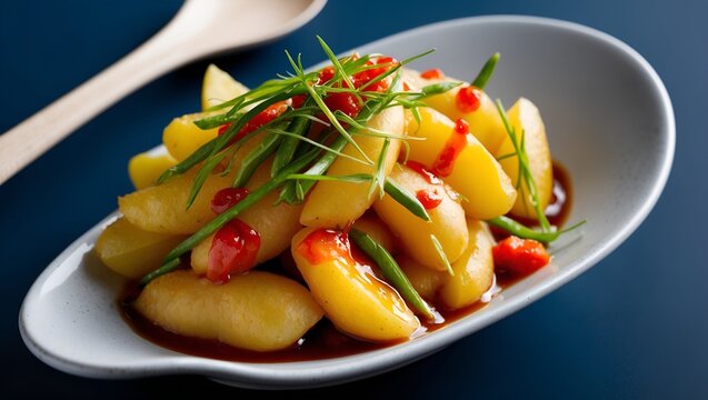Top-down shot of golden Hweori Gamja on modern plate, crisp spiral texture with dip. Clean minimal layout, ultra-realistic and artistically lit, perfect for mockups.