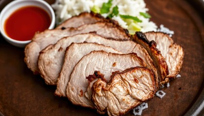 a plate of sliced meat, likely pork, with a side of rice and sauce, possibly kimchi, placed on a wooden table