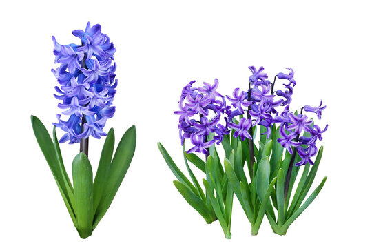 Purple hyacinth flowers with leaves isolated transparent png. Hyacinthus spring plants. Seven objects set.