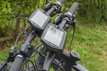 A dark-colored hybrid bicycle with a sturdy frame and visible gears.
