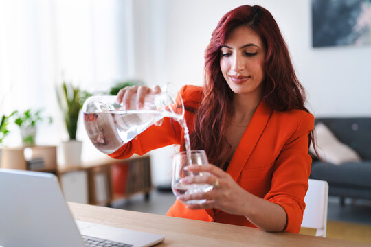 An Arab woman in a blazer pours water into a glass. She is at a desk with a laptop, staying hydrated while working from home.