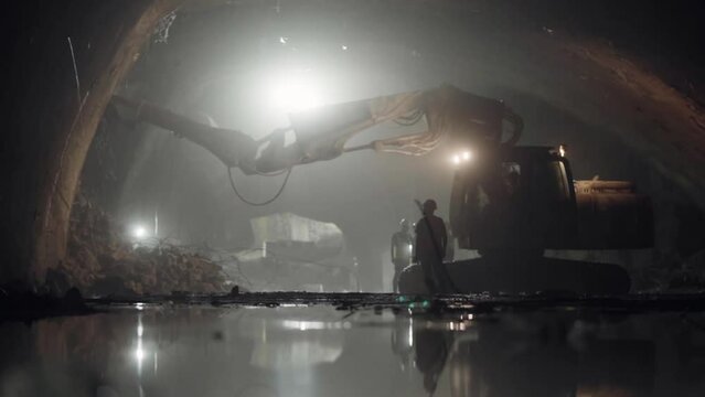 Dnipro, Ukraine - August 27, 2021: Large tracked excavator with pneumatic hammer breaks rocks during tunnel construction