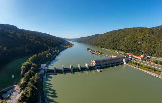 Germany, Bavaria, Untergriesbach, Drone view of Jochenstein hydroelectric power station