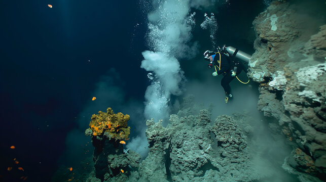 Marine cute biologist collecting samples near a hydrothermal vent on the seafloor while exotic deep-sea creatures hover around.