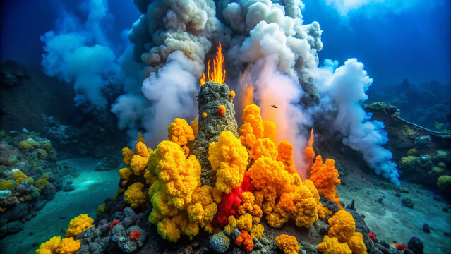 A mesmerizing deep sea hydrothermal vent erupts with vibrant orange and yellow smokers, surrounded by a diverse array of exotic marine life.