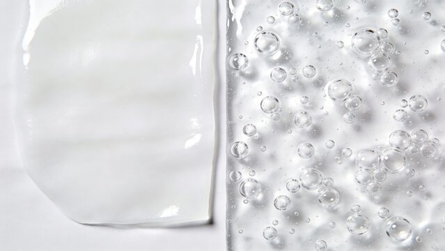 Minimalistic macro texture of white cream and clear gel with air bubbles on a bright background. Abstract beauty skincare layout for cosmetic products, spa branding and advertising design.