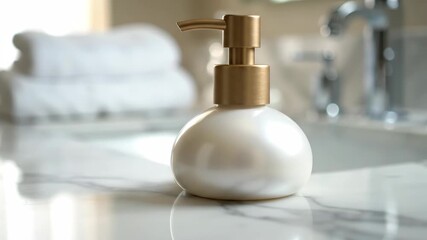 White pearlescent soap dispenser with gold pump rotating on marble countertop. Luxury bathroom product for hygiene and self-care. Fresh spring cosmetic concept