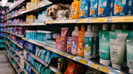 Pet care products displayed on a store shelf