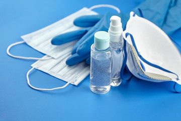 Set of blue bottles for hygiene isolated on white background.