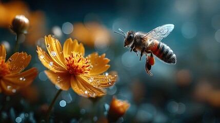 Close-up of a Bee Landing on a Flower and Collecting Nectar in Natural Ecology
